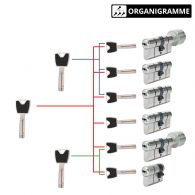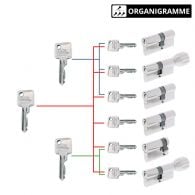 Ces 3 types d’organigramme de clés peuvent donc être combinés ensemble, mais peuvent aussi fonctionner avec du cylindre s’entrouvrant (lorsque plusieurs serrures s’ouvrent avec la même clé).